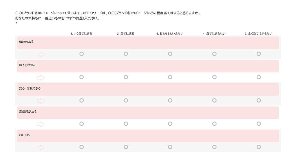 以上のようなブランドイメージを聴取する場合は、いくつかのワードを評価してもらう方法が多いです。