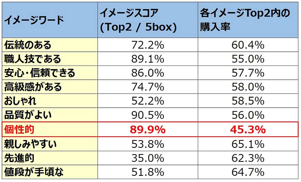 その仮説を検証する為にイメージについての質問の中に『個性的』というワードを追加し、また『おしゃれ』、『先進的』なども加えたのです。