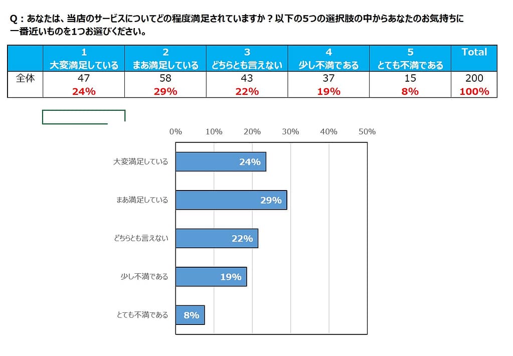 例えば以下の様に、あなたのお店に来店した方200名に『当店のサービスに満足しましたか?』というアンケートを5段階評価で取ったとしましょう。