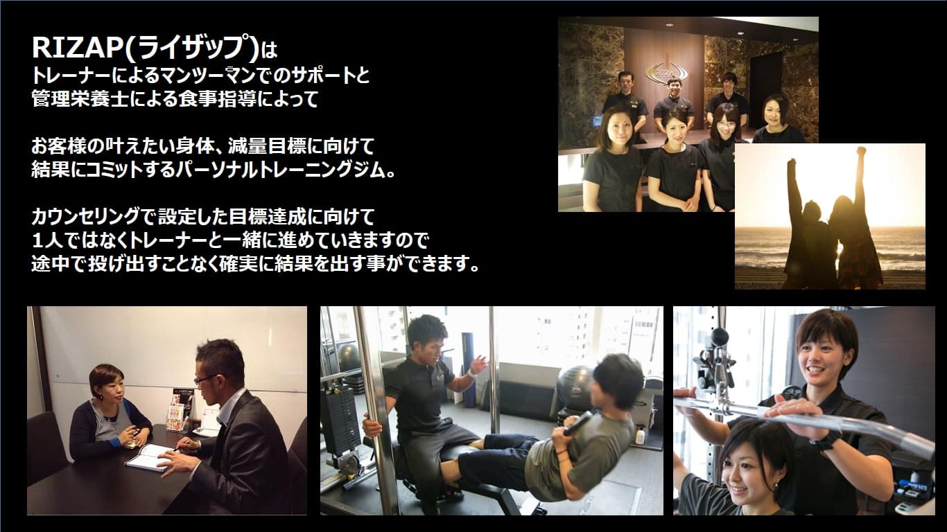 RIZAPは筋力トレーニングと食事指導をメインとしたダイエットプログラムを提供しており、テレビCMでも話題になりましたが『結果にコミットする』事が商品の最大の特徴ですよね。