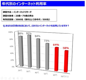 こちらの会社はこのデータを使って、『70代の方でも58%がインターネットを活用する時代!』という事が言いたいのだそうです。