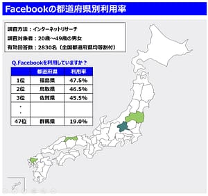 ということは、この結果が正しいのであれば、Facebook広告で何かしら商品の宣伝をすると福島や鳥取では効果が期待できますが、群馬ではあまり期待できないということになります。