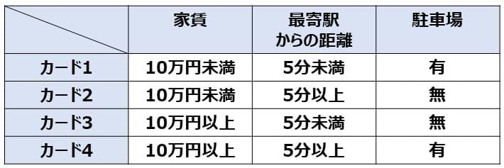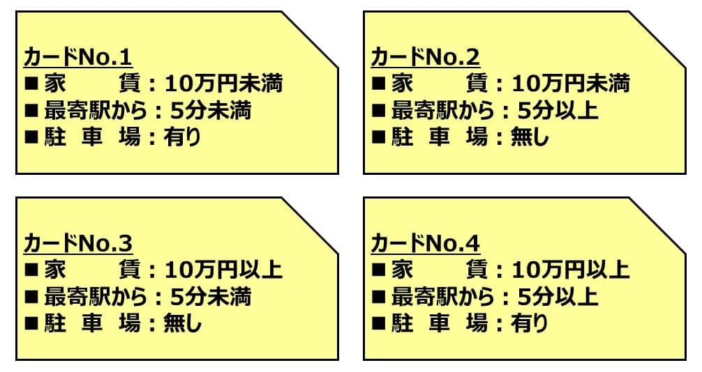 まだ8個ならばよいのですが、もし項目を1つ増やすとなると(例:部屋の数)必要なカードは倍の16枚になってしまうので評価が難しくなります。