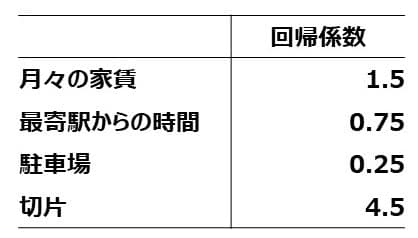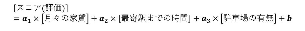 この式をよく見ていただきたいのですが、a1の値が大きいほど『月々の家賃』がスコアに与える影響が大きくなりますよね。