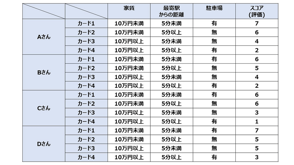そして回答者はそれぞれのカードの内容を見て、自分の購入したい度合をスコア付けしたり、または購入したい順に並べたりしてもらいます。
