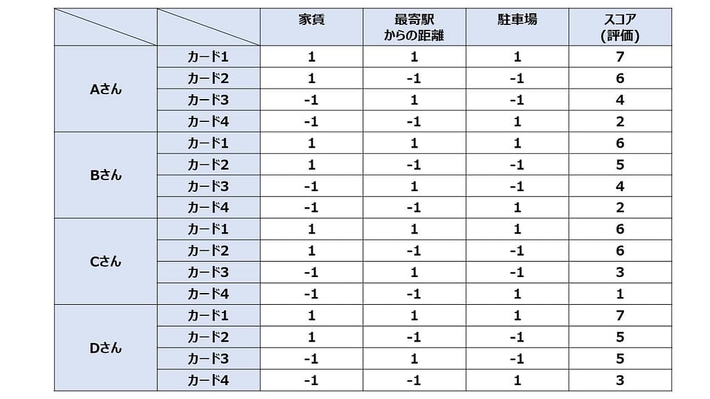 例えば先ほどのマンションの項目3つの事例(8通りの組合せ)だと、4枚のカードを作って評価すれば8枚評価したのと同じ結論が得られる方法があるのです。