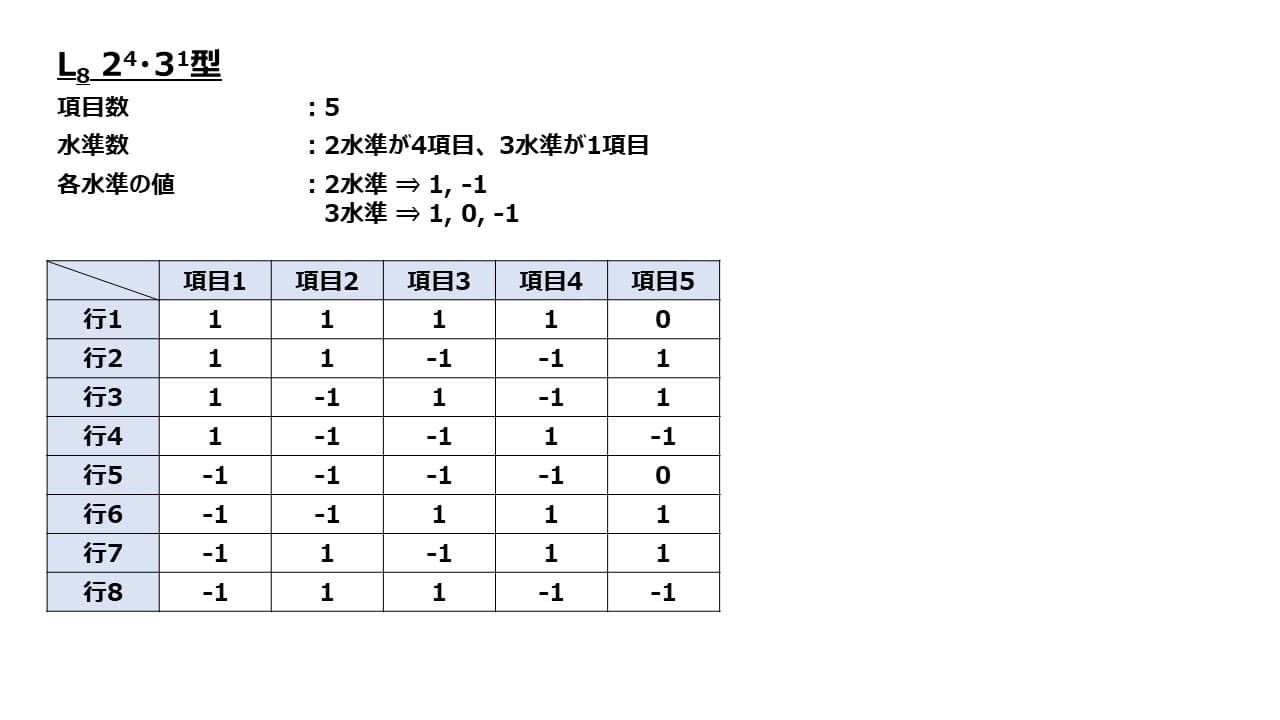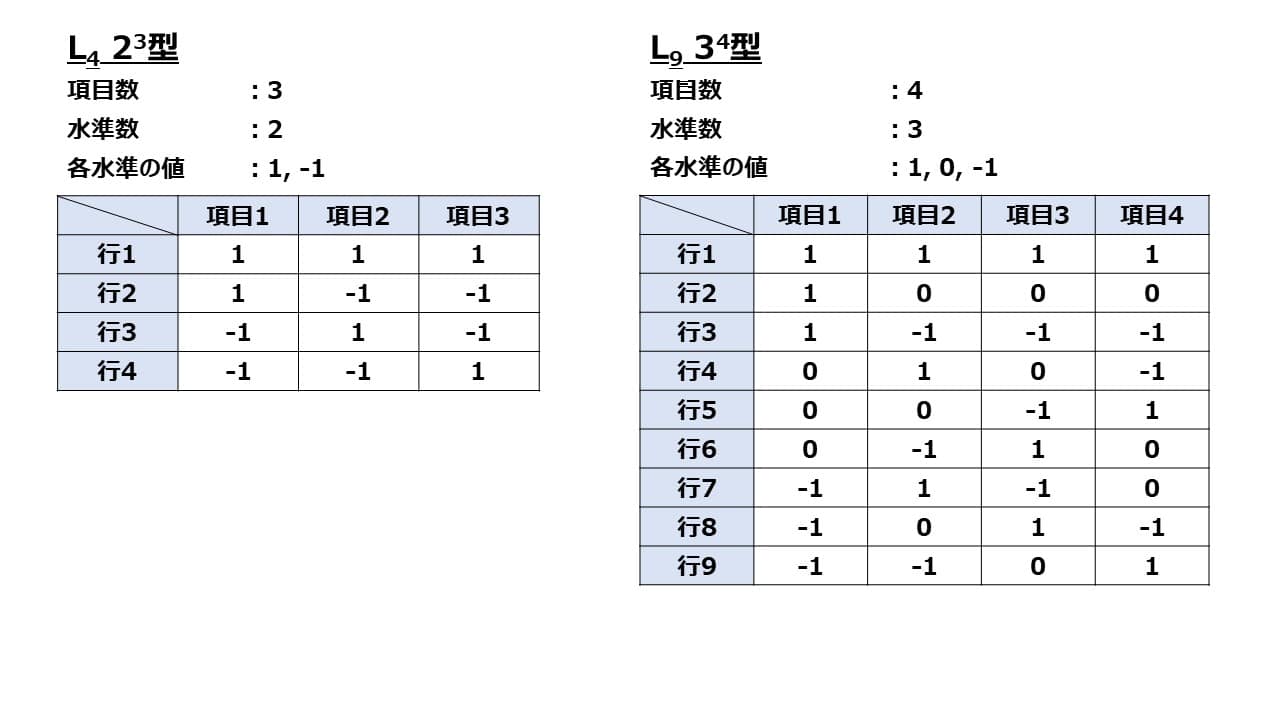 直交表とは、水準の全ての組合せが同数回現れるように配列させた表の事を指します。