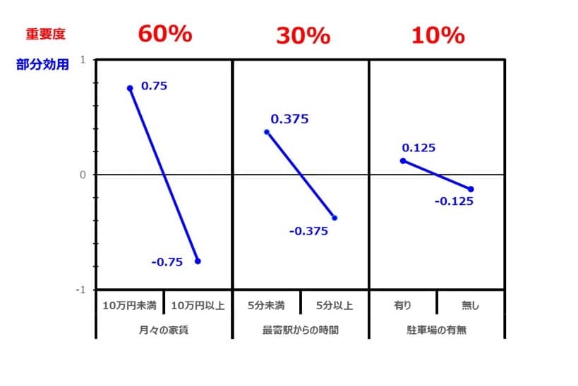 今回の結果を見ると、『月々の家賃』、『最寄り駅までの時間』、『駐車場の有無』の部分効用の幅は、1.5、0.75、0.25となり、合計は2.5になります。