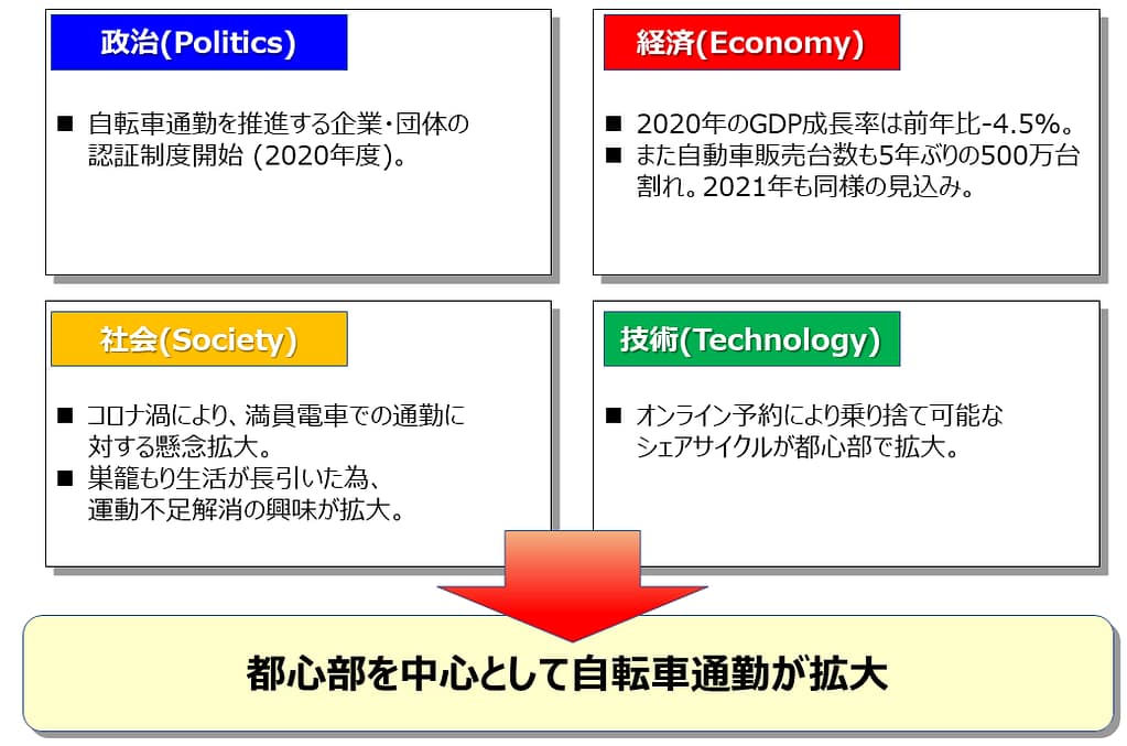 上記の場合、コロナにより自動車の販売台数が減少、また感染予防の為に満員電車での通勤の懸念拡大、更には政府が自転車通勤を推進する認証制度を開始、乗り捨て可能なシェアサイクルビジネスの拡大・・・と、これらを総合して考えると、おそらく自転車通勤が今後拡大していくだろうなと予測できますよね。